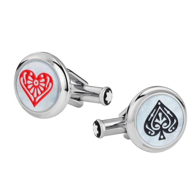 I Gemelli Montblanc Meisterstück Rendono Omaggio Al Libro "Il Giro Del Mondo In 80 Giorni". Questo Gioiello In Acciaio Intarsiato Con Madreperla Reca In Rilievo Gli Assi Di Picche E Cuori, Due Dettagli Che Si Ispirano A Uno Degli Elementi Chiave Del Romanzo: I Semi Del Mazzo Di Carte.