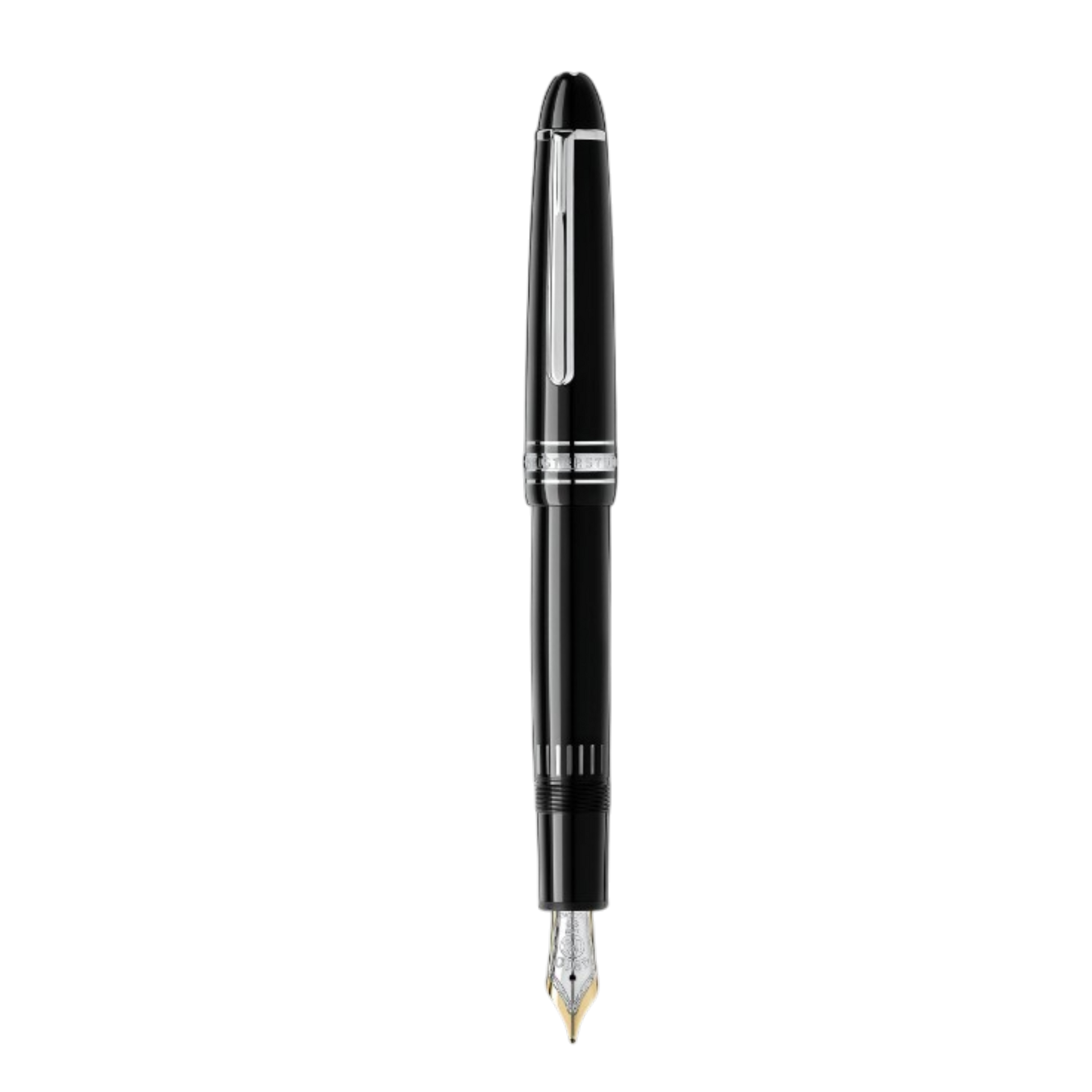 Stilografica a stantuffo con pennino in oro 14 K con inserti rodiati, serbatoio e cappuccio in pregiata resina nera con emblema Montblanc intarsiato, clip e anelli finitura platino