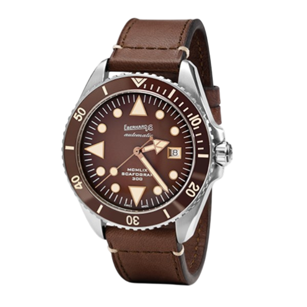 QUADRANTE MARRONE “DÉGRADÉ”. INDICI APPLICATI TONDI E DI FORMA TRIANGOLARE A ORE 6-9-12, CON LUMINESCENZA VINTAGE E CONTORNI DORATI 4N. FINESTRA DELLA DATA A ORE 3, DI FORMA RETTANGOLARE, DORATA 4N.
