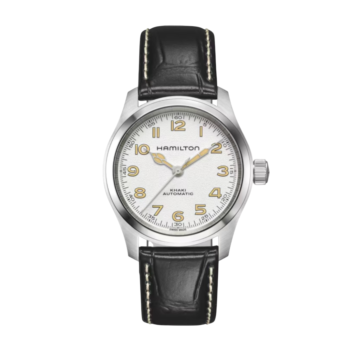 L'originale Murph, icona del mondo del cinema, viene rivisitato in chiave moderna. Il nuovo quadrante bianco anticato con finitura perlage ospita sfere a cattedrale dal tocco vintage. Pensato per gli amanti di Hamilton ma anche di Hollywood, questo segnatempo è provvisto di un cinturino in pelle nera.